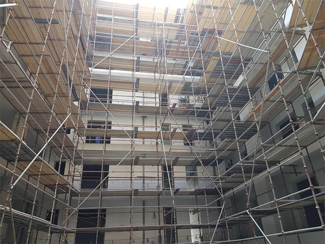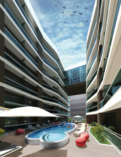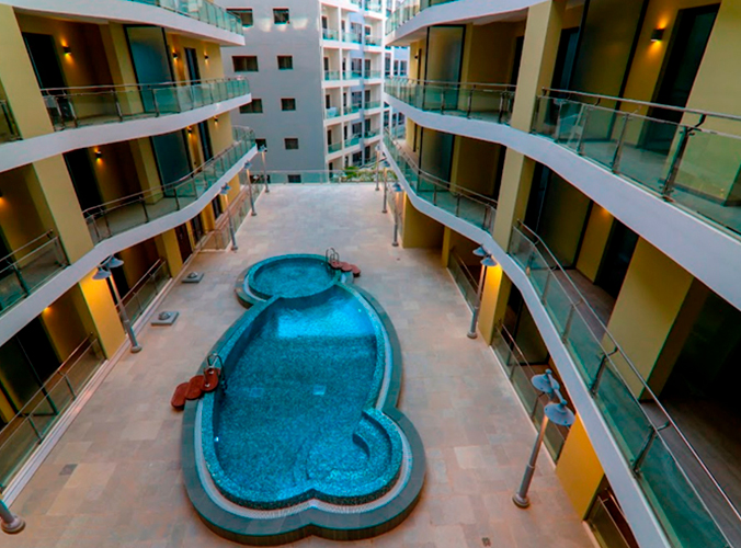 Ciò permette la realizzazione di un’area per il tempo libero (a disposizione dei proprietari degli appartamenti) con piscina al livello di piano primo e, soprattutto una efficiente illuminazione naturale degli appartamenti con fronte principale verso l’interno. La dimensione degli appartamenti è compresa tra 70 mq e 240 mq con livelli di finiture di elevata qualità.